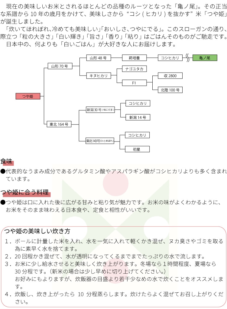 日本一を誇るブナの原生林が育む滋養に満ちた水系、先人の知恵と四季鮮やかな山形の風土が生んだ、わが国の美味しいお米のルーツとなる「亀ノ尾」。その正当な系譜から、山形のブランド米「つや姫」が誕生しました。