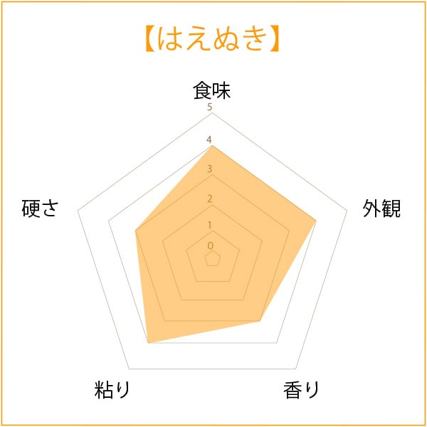 平成4年にデビューした山形生まれのお米。絶対的な品質の高さを狙った『ユメのコメ』として、10年の歳月をかけて研究・育成された山形県オリジナル品種です。「はえぬき」は、収量・品質が安定していることから、いもち病に弱く倒れやすかった「ササニシキ」に代わり、瞬く間に県の主力品種に駆け上がりました。